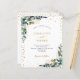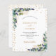 A white background decorated with eucalyptus greenery, golden foliage and hearts. Personalise and add your names and wedding details. Black and golden coloured letters.