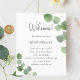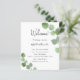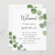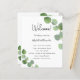 A modern, elegant, wedding program, timeline. White background, decorated with eucalyptus greenery, sprigs. Personalise and add your names and wedding details. Black coloured letters. If you have more text it's possible to reduce the line space and also add text on the back.