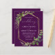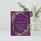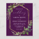 This elegant rustic wedding invitation features a gold faux foil geometric frame decorated with eucalyptus and olive greenery on a deep eggplant purple background. The word "wedding" appears in calligraphic script. Customise the white text with the names of the bride and groom and the wedding details on the front, and their initials and website URL on the reverse.