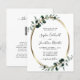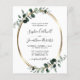 Budget Eucalyptus All in One QR Code RSVP Gold Metallic Wedding Invitation... Our "All in One" luxe botanical wedding invitation features a gold metallic oval frame embellished with emerald-hued eucalyptus leaves bordering your personalised wedding invitation text. The back of the invitation also displays your wedding website QR code as well as the website's URL itself allowing your invitees to easily RSVP online and view all of the details normally sent in a wedding packet. This modern style wedding invitation was designed to be both elegant and budget conscious... not to mention time-saving. All example text can be easily revised with your own information on the personalisation template. PLEASE NOTE: Budget cards do not automatically come with envelopes, as do the traditional invitation cards, but you can purchase them on the same page at checkout if you wish. This all in one QR code RSVP design is also available on a traditional 5x7 wedding invitation card.