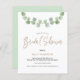A budget price SMALLER 4.5” x 5.6” alternative. Available in a SEMI-GLOSS 110 lb CARD STOCK which is the default option (thicker for invitations), OR a SATIN FINISH 80 lb THINNER PAPER STOCK (ideal for enclosures). Envelopes are an optional extra and are slightly larger than the card size. . This minimalist style design has an elegant eucalyptus leaf branch across the top and typography centred below. Bridal Shower is set in a modern stylish script, and the rest of the text you can easily personalise. You can also change the colour of the coordinating green background colour on the reverse if required. The square card adds a contemporary touch.