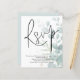 Budget Eucalyptus Script QR Code Wedding RSVP. A budget price SMALLER 4.5” x 5.6” alternative. Available in a SEMI-GLOSS 110 lb CARD STOCK which is the default option (thicker for invitations), OR a SATIN FINISH 80 lb THINNER PAPER STOCK (ideal for enclosures). Add your QR code to your reply page on your wedding website on the back by replacing the QR code on the sample. You can create QR codes for free online. Simply search “QR code creator” and lots of options come up to create for free. A stylish set typography in black for the main heading RSVP complementing the rest of the text which you can easily personalise. Blue eucalyptus leaves are tinted into the background with the text partially overlaid on top. A coordinating powder blue background is also on the back.