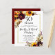 Rustic fall flowers decorate a thin gold frame. Burgundy red flowers, deep yellow sunflowers, white flowers all create a beautiful floral arragement. 50 years is written at the top of the invitation. The anniversary couple's names are written in a modern trendy text.