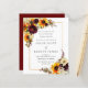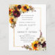Golden sunflowers, dark red roses and ivory white hydrangea flowers are nestled in autumn leaves and berries. They decorate a gold frame that surrounds your bridal shower details. The back of the bridal shower invitation is deep burgundy red. This item coordinates with the Sunflower and Burgundy Wedding collection. It contains the templates you need to create a wedding invitation suite, wedding signs and reception supplies as well.