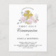 Very pretty First Communion invitation features a gold cross surrounded by blush pink roses and sage green leaves. Traditional fonts give this invitation a classic appearance.