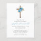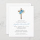 This elegant baptism invitation features a watercolor bouquet of blue flowers and gold foliage on a simple wooden cross, above the words "please join us for the baptism of our daughter" in charcoal grey italic font. Personalise it with her name in delicate blue handwriting calligraphy, with the details in grey sans serif font on a white background. Ideal for a girl's baptism.