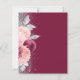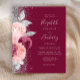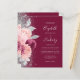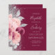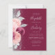 The left-hand edge of this elegant modern wedding invitation features a floral bouquet in shades of burgundy and blush pink, trimmed with silver faux foil and faux glitter foliage and sprinkled with silver faux glitter. The customisable text combines silver grey handwriting script, copperplate and italic fonts on a burgundy background. The reverse side features a matching burgundy, blush and silver floral design.