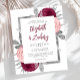 This design features lush bouquets of burgundy red, blush pink and silver flowers adorning a silver faux foil rectangular frame. Customise the text on a white background with the first names of the bride and groom in modern burgundy handwriting script, with the date, time and wedding venue in charcoal grey sans serif font. The back of the card is a matching shade of solid burgundy.
