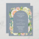 All-in-one dusty blue wedding invitations feature your details on the front and back in chic white lettering. Beautiful watercolor flowers - white and green hydrangeas, pink and cream roses, daisies, small stems and leaves - on the front with your info on an arched overlay. Printed on affordable, budget 110 lb. paper. **WHITE ENVELOPES are an additional cost. The Live Design Service can help you with your design layout or colours if needed. MATCHING items in our store.