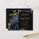 This elegant, moody wedding Save the Date card features a lush, romantic floral bouquet in navy blue with gold faux foil and glitter foliage on a black background. Customise the gold-coloured text in stylish fonts on a black rectangle, and add your wedding website URL to the solid black back.