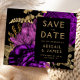 This elegant, moody wedding Save the Date card features a lush, romantic floral bouquet in purple with gold faux foil and glitter foliage on a black background. Customise the gold-coloured text in stylish fonts on a black rectangle, and add your wedding website URL to the solid black back.