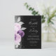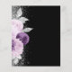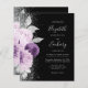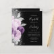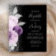 The left-hand edge of this elegant modern wedding invitation features a floral bouquet in shades of purple and lavender, trimmed with silver faux foil and faux glitter foliage and sprinkled with silver faux glitter. The customisable text combines pale silver grey handwriting script, copperplate and italic fonts on a black background. The reverse side features a matching floral design.