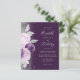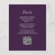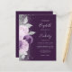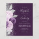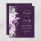 The left-hand edge of this elegant modern wedding invitation features a floral bouquet in shades of purple and lavender, trimmed with silver faux foil and faux glitter foliage and sprinkled with silver faux glitter. The customisable text combines pale silver grey handwriting script, copperplate and italic fonts on a purple background. Add additional details on the back, along with a QR code to help your guests visit your wedding website.