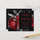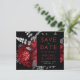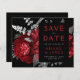 This elegant, moody wedding Save the Date card features a lush, romantic floral bouquet in red with silver faux foil and glitter foliage on a black background. Customise the silver grey and red text in stylish fonts on a black rectangle, and add your wedding website URL to the solid black back.