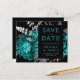 This elegant, moody wedding Save the Date card features a lush, romantic floral bouquet in teal blue with silver faux foil and glitter foliage on a black background. Customise the silver grey and teal text in stylish fonts on a black rectangle. Add additional details on the back, and enter your wedding website URL to generate a QR code.