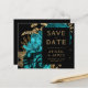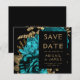 This elegant, moody wedding Save the Date card features a lush, romantic floral bouquet in turquoise with gold faux foil and glitter foliage on a black background. Customise the gold-coloured text in stylish fonts on a black rectangle, and add your wedding website URL to the solid black back.
