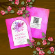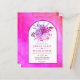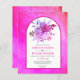 BUDGET Flowers and arch magenta pink wedding invitation with QR code for RSVP. This lovely wedding design displays an arch frame on fuchsia pink stained background. In the frame there is a dalia and rose flowers, foliage and pampas grass. The back includes the QR code to RSVP online.