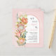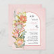 BUDGET Tropical protea flowers pampas grass and eucalyprus leaves soft pink arch wedding invitation with QR code. This pretty wedding design showcases an arch frame on blush pink stained background with your initals and text. On the left there are protea flowers, pampas grass, a palm leaf and eucalyptus leaves. The back includes your QR code for RSVP.