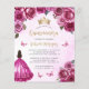 This lovely quinceañera invitation features a border of fuchsia pink roses on a pink watercolor background. A gold tiara, a dark-haired girl in a fuchsia princess dress and small pink butterflies decorate the text. The word "Quinceañera" and the name of the guest of honour appear in elegant gold-coloured handwriting script, with the remaining text in grey sans serif font.
