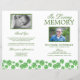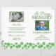 Irish budget funeral program featuring a traditional white background, green watercolor clovers, a photo of your lost loved one, the funeral details, an obituary, order of service, the details of the wake, another photo on the back page, and a personalised thank you note. PLEASE NOTE: These come as a flat piece of quality paper, you will need to fold them yourself.