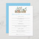 Boho Game Advice New Mum Dad Blue Boy Baby Shower. A budget friendly paper smaller 4.5” x 5.6” paper alternative. Envelopes are an optional extra. A fun game for your baby shower, ask your guests to fill in the spaces to answer the questions. A boho style illustration of shelf with plants and baby toys is at the top and stylish informal set script for header in blue and a coordinating blue background on the other side. You can easily personalise the rest of the text to your own requirements and change the background colours if you wish via the customise further option.