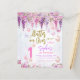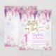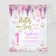 Design features pastel colours like lavender, mint, and baby pink, adorned with gentle wisteria flowers and playful butterflies. These elements create a soft, magical feel. The invitation features the words "Flutter on over" in shiny gold glitter script, adding a touch of sparkle and fun. This simple yet enchanting design is perfect for a joyful birthday celebration like 1st birthday, 7th birthday and more.