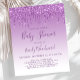 This trendy baby shower invitation features a border of sparkly dripping purple faux glitter on an ombre purple background. The words "Baby Shower" and the name of the mum-to-be appear in purple handwriting script, with the remaining text in purple sans serif font.