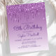This trendy 18th birthday party invitation features a sparkly purple faux glitter drip border and purple ombre background. The words "18th Birthday" and the name of the guest of honour appear in casual purple handwriting script, with the rest of the customisable text in sans serif font. The same purple glitter drip design appears on the reverse side.
