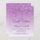 This trendy Sweet Sixteen birthday party invitation features a sparkly purple faux glitter drip border and purple ombre background. The words "Sweet Sixteen" and the name of the guest of honour appear in casual purple handwriting script, with the rest of the customisable text in sans serif font. The same purple glitter drip design appears on the reverse side.