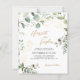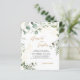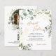 Design feature greenery eucalyptus watercolor with floral gold glitter elements. Using elegant calligraphy font in gold color for the name of the bride and groom that makes it stand-out. It also features couple photo at the back with elegant script monogram.