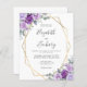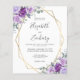 This elegant modern wedding invitation features a gold geometric frame decorated with purple and lavender watercolor flowers and eucalyptus greenery on a white background. The customisable text combines charcoal grey whimsical handwriting, copperplate and italic fonts. The reverse side is solid white. (NOTE: Envelopes are not included automatically with this budget invitation. To add envelopes to your order, please use the "Envelopes" drop-down menu.)