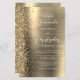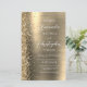 The left-hand edge of this elegant modern wedding invitation features a gold faux glitter border. The customisable text combines white handwriting, copperplate and italic fonts on a gold faux brushed metal background. The reverse side features a matching glitter and brushed metal design.