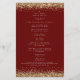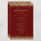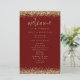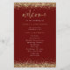 Budget Gold Glitter Burgundy Wedding Program. Size 5.5” x 8.5” at a budget price, on an elegant 110 lb LINEN stock – for a luxury feel at great value, this is perfect for programs, as well as invitations and menus etc. This budget size alternative is also available in other paper choices. The SEMI-GLOSS 110 lb card stock is about the same thickness as a postcard, so also works well for invitations. The FELT 100 lbs paper is buff coloured, NOT white, so adds a rustic touch. The MATTE 80lbs paper stock is bright white, for crisp printing, great for your menus and programs, whilst the SATIN 80lbs paper is thin and light, ideal for enclosures. This elegant design has faux glitter gold borders on each side. Welcome is in a set informal handwritten style script and the rest of the words you can easily personalise.