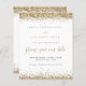Gold Glitter Borders Script Wedding Save The Date. A budget price SMALLER 4.5” x 5.6” alternative. Available in a SEMI GLOSS 110 lb CARD STOCK which is the default option (recommended for invitations), OR a SATIN FINISH 80 lb THINNER PAPER STOCK (ideal for enclosures). Envelopes are an optional extra and are slightly larger than the card size. Gold faux glitter at the top and bottom edges and an informal set script for Save Our date. Easily personalise the rest of the text to your details.