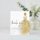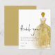 Budget Gold Gown Blonde Girl Quinceañera Thank You. A budget price SMALLER 4.5” x 5.6” alternative. Available in a SEMI GLOSS 110 lb CARD STOCK which is the default option (recommended for invitations), OR a SATIN FINISH 80 lb THINNER PAPER STOCK (ideal for enclosures). Elegant style for your 15th birthday party thank yous with the backview of a girl with blonde hair in a beautiful sparkly gold dress to the right, and Thank You in a set handwritten style script. Easily personalise the rest of the text to your own details. A coordinating gold background is on the other side which can be changed to another colour if you wish via customise further, as can the colour of the text.