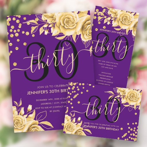 Elegant Glam Gold Purple Floral Glitter 30th Birthday Script invitation template featuring flower arrangement, glitter confetti and modern typography script.