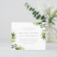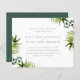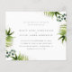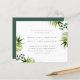 This tropical-themed wedding invitation is perfect for summer outdoor celebrations. Featuring watercolor palm leaves and eucalyptus greenery with faux gold foil dust. Your wedding information is shown with chic minimal typography against a white background. Reversing to a hunter green background. As part of the budget selection here on Zazzle, these invitations do not come with envelopes nor do they fit snugly in a standard-sized envelope. The closest size is A6 but there will be a gap of approximately half an inch. If you don't mind the lack of snugness you could use such widely available A6 envelopes. Otherwise, this design can be transferred to a standard 5x7 format (which comes with envelopes) using the design transfer tool. As a rough guide, as of the time of writing, 100 budget invitations (including a volume discount) would cost around $39 whereas 100 standard 5x7 invites including envelopes would cost approximately $135. Your mileage may vary depending on Zazzle's available promo codes, site-wide sales, or changes in pricing.