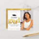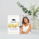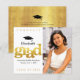 Announce to the world that your favourite grad has reached their milestone with this stunning, simple, modern, personalised budget announcement invite. Bold, graphic, antique, faux gold foil typography, black typography and black cap icon overlay a modern, white background. On the right hand side, add a photo of your choice. Personalise the custom text with your graduate’s name, school name, date, and class year. On the back, add your personal note, next school they’re attending, party information, etc. Guaranteed to add stylish fun to their special occasion!