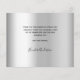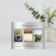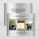 Add 3 of your photos, vertical size, a date, name, and the thank you note. A faux silver looking background with black text and frame. The text: Thank you on the front and your name on the back are written with a stylish hand lettered script with swashes.