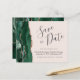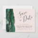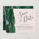 This elegant budget save the date card features an emerald green watercolor agate border trimmed with faux rose gold glitter. The customisable text combines charcoal grey handwriting script, copperplate and italic fonts on a blush pink background. The reverse side features a matching emerald green and rose gold agate design.