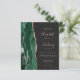 The left-hand edge of this elegant modern wedding invitation features an emerald green watercolor agate border trimmed with faux rose gold glitter. The customizable text combines rose pink handwriting, copperplate and italic fonts on a dark off-black background. The reverse side provides spaces for 4 photos (1 square, 2 horizontal, 1 long vertical) and room for your wedding website URL or other information.