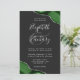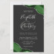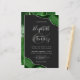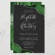 A hunter green watercolor agate design trimmed with faux silver glitter appears in two corners of this elegant design. Personalize it with the couple's names in silver gray handwriting script over a large gray ampersand. Add the wedding details in silver gray copperplate and italic fonts on a slate black background. The reverse side features a matching green and silver agate design.