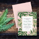 Green and gold tropical monstera and palm leaves budget wedding invitation. It showcases a pattern of tropical leaves with gold outline on blush pink and your text in a white frame. The back includes a gold polka dot pattern.