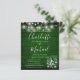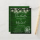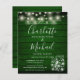 A stylish rustic budget wedding invitation featuring pretty string lights, mason jars, signature style names and chic typography on an emerald green rustic wood background. Designed by Thisisnotme©