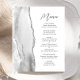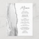 The left-hand edge of this elegant modern wedding menu features a grey watercolor agate design trimmed with faux silver glitter. The customisable text combines charcoal grey handwriting script and sans serif fonts on a white background. The grey and silver agate design is repeated on the reverse side.