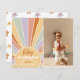 Boho birthday party invites with a custom photo of your choice! Retro-inspired birthday party invitations featuring a hippie-style sun, colourful daisies, and groovy fonts. The front of this budget card features a hand-drawn sun with rays of sunshine in different pastel rainbow colours. The colours are soft tones, so the overall appearance of the card keeps a bright, simple minimalist feel even though it is colourful and fun! Inside the centre of the sun, the birthday girl's name is written in a chic handwriting script. Her age appears underneath in bold groovy typography. On the right-hand side of the card, a photo of the birthday girl is framed by a white, hand-drawn border. The cards reverse to a cute pattern of colourful daisy flowers. Perfect for any age girl. For boho events, retro 60s or 70s themes, hippie styles, spring birthdays, pool parties, summer fun, sun-themed celebrations, and more! This invitation template is editable online, simply click on "Personalise this template" to get started. For more advanced edits, select "click to customise further" to access Zazzle's Design Tool. As part of the budget selection on Zazzle, this sheet isn't a standard invite size or paper quality. If you want this design on an invitation card you can find it in our store or use the Zazzle Make Machine to transfer it onto the product of your choice. Please note the cards are printed as you see them on your screen when ordering, so be sure to double-check for typos! Other versions of this design are available in the collection linked on this page. Browse my store for more sunshine birthday party invitations.