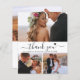 Budget, Minimalist Modern Elegant „Thank You” Script 3 Photo Collage Wedding Thank You personalised affordable low budget thin card. Stylish wedding thank you card template featuring four photo on the front and one photo on the back. ***PLEASE NOTE! *** BUDGET PAPER/FLYER IS PAPER THIN. *** UPGRADE THE PAPER FOR A THICKER PAPER. *** With the text „Thank You” in a cursive hand lettering typography script font with swash tail and little love heart in black and white. Personalise your custom name and thank you message. If you prefer to handwrite your note, just delete the sample text to make more space. Great choice for a low budget wedding.