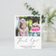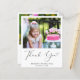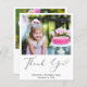 Budget-friendly thank you card for her birthday party featuring her photo and "Thank You" in an elegant contemporary script with a heart swash. Personalise with her first name and the event date in simple modern typography. On the reverse side, add an additional photo, her customised thank you message and her name in a signature-like script.