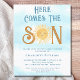 It features the text "Here Comes The Son" in blue retro typography and a cute yellow watercolor smiling sun on a blue sky background.