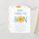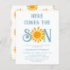 Invite family and friends to your baby shower with this sun-themed boys' baby shower budget invitation. It features the text "Here Comes The Son" in blue typography with a bright yellow watercolor sun. The back is decorated with a sun pattern. Easily customisable. Original Watercolor © Michele Davies.